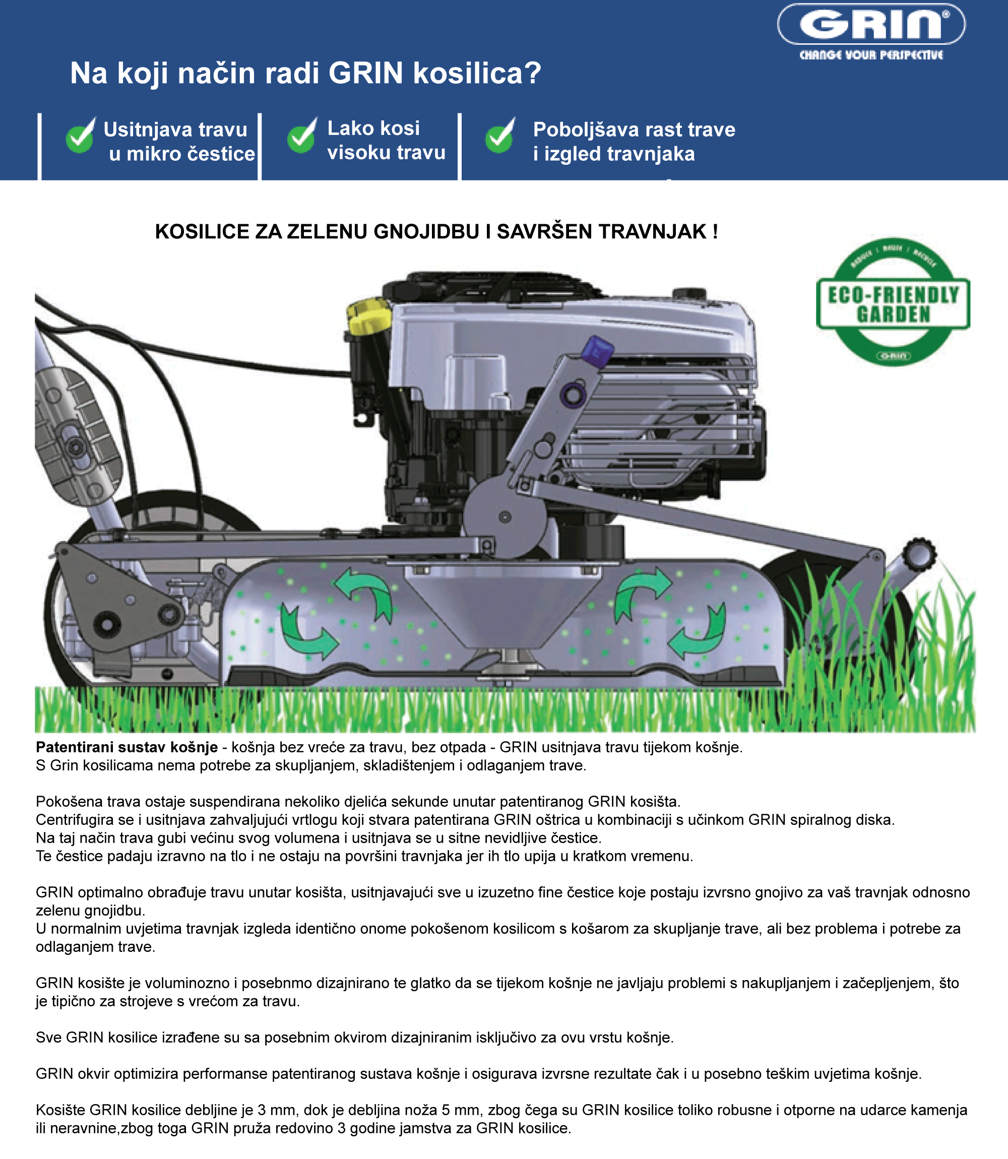 • GRIN kosilice ne koriste tradicionalni koš za travu—umjesto toga, travu usitnjavaju i raspršuju kroz iskoristivi vrtni mulč.